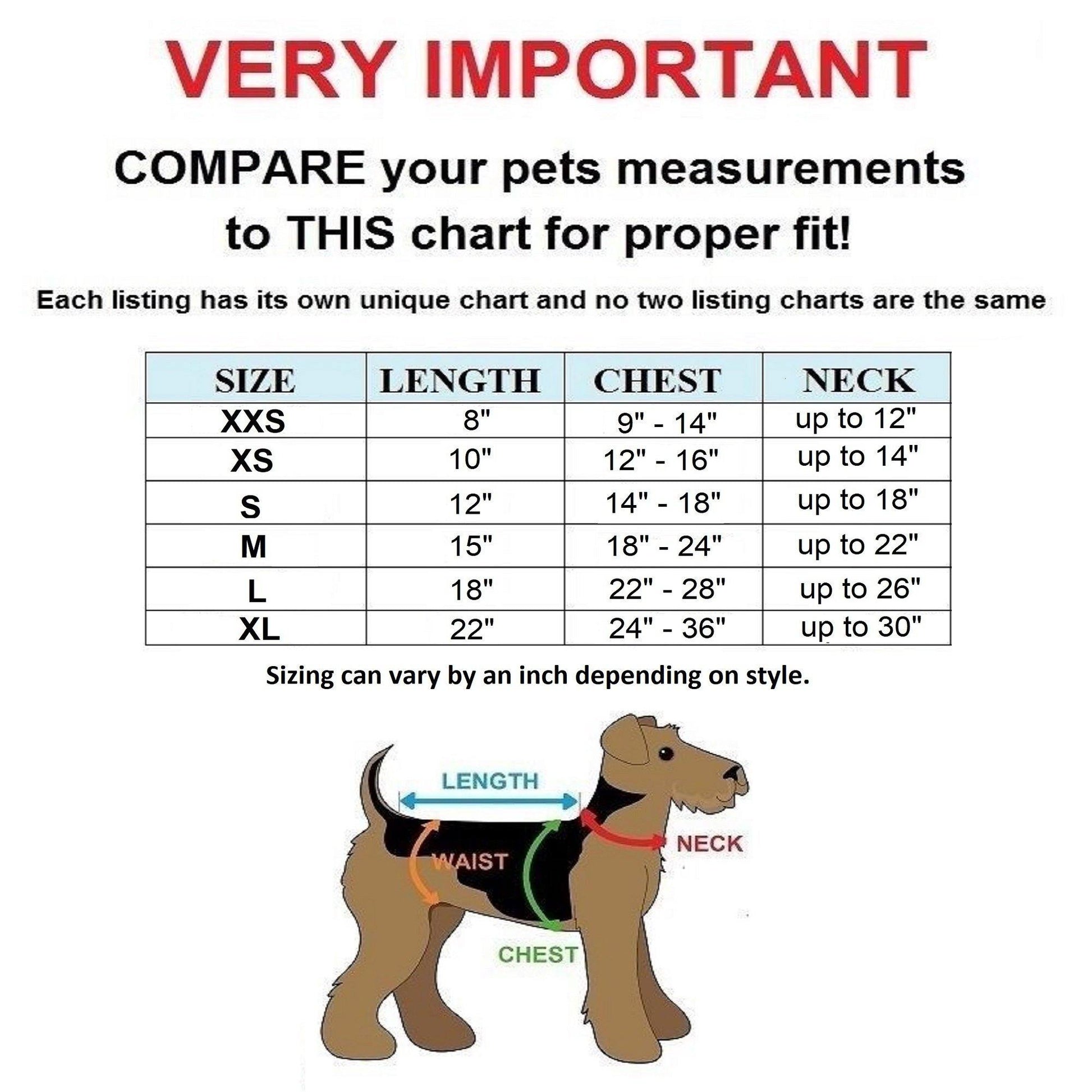 ATTENTION! THERE IS NO STANDARD SIZING SYSTEM FOR PET CLOTHING. Pet clothing is based on MEASUREMENTS and not weight or breed! Before placing an order, please measure your pets' LENGTH, CHEST and compare them to the sizing chart provided in the photos and size options. Each and every different brand/style of pet clothing has its own sizing system. One brand size Small can very well be another brand size X-Large. Each brand, item and style has its own unique sizing chart and no two charts are the same.
